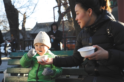 代女士已經連續13年來雍和宮喝臘八粥了。她說,自己懷孕時偶然趕上雍和宮舍粥,因為自己是高齡產婦,許愿“母子平安”。隨后每年臘八她都帶上家人來喝上一碗粥,今年恰逢周末,她就帶上兒子一起來,“參與這個節日已經成了我們家的傳統,每年來這里祈福納祥。”(記者 張彤 攝影/記者 王飛)