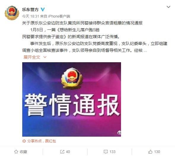 近日,有媒體報道海南樂東黎族自治縣居民邢先生為了給新生兒落戶,跑了5趟派出所,甚至被民警索要親子鑒定的“折騰”經歷,引發關注。1月13日,海南樂東黎族自治縣公安局發布通報稱,涉事民警未能及時核實戶籍辦理材料,導致戶籍辦理時間較長,且在接待群眾時出現言語不當、行為粗暴的情況。因此,對涉事民警給予通報批評處理,并調離原工作崗位。