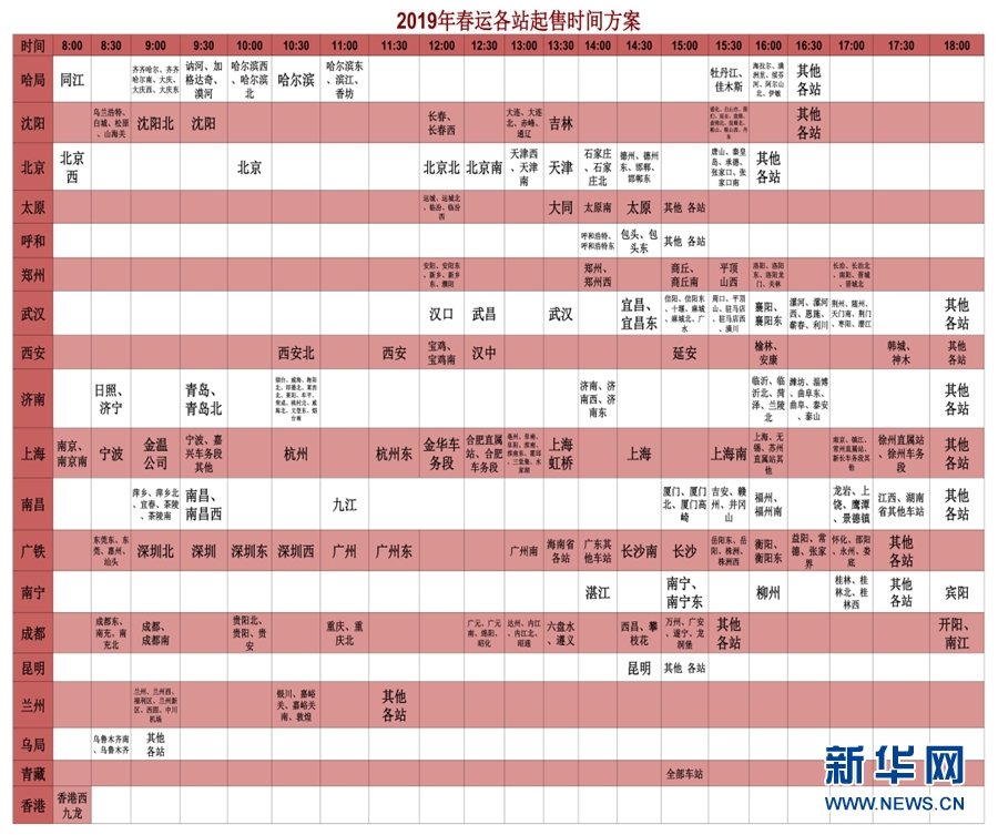 圖為2019年春運各站起售時間分配方案。(12306供圖)