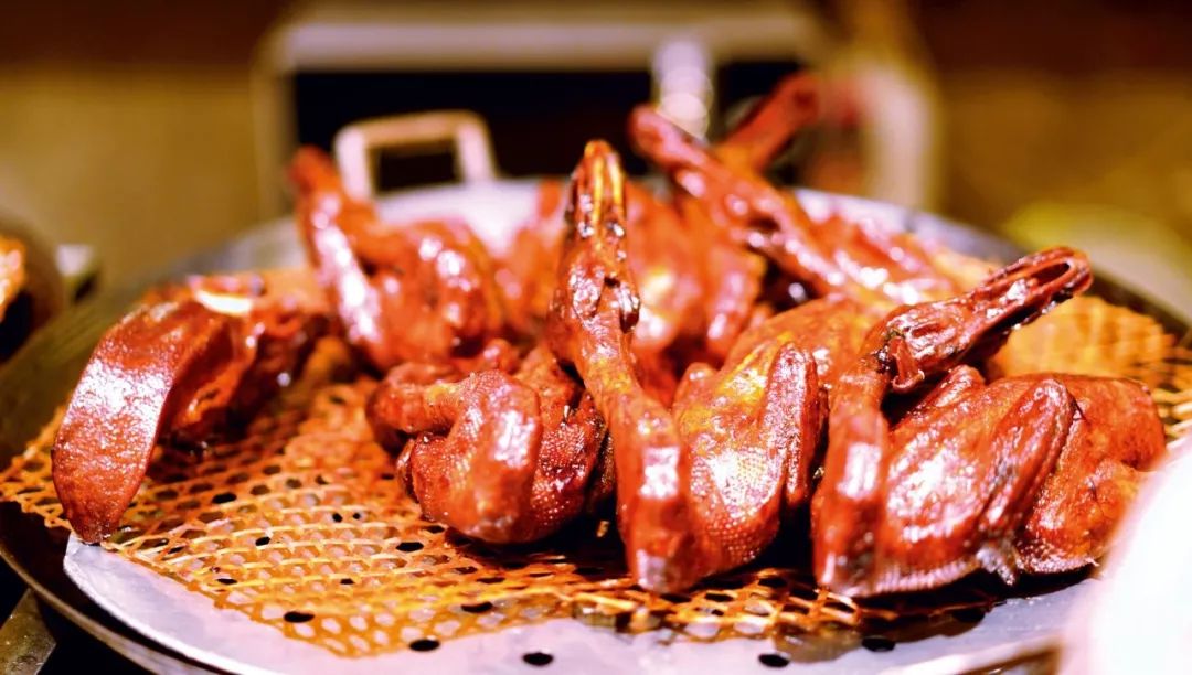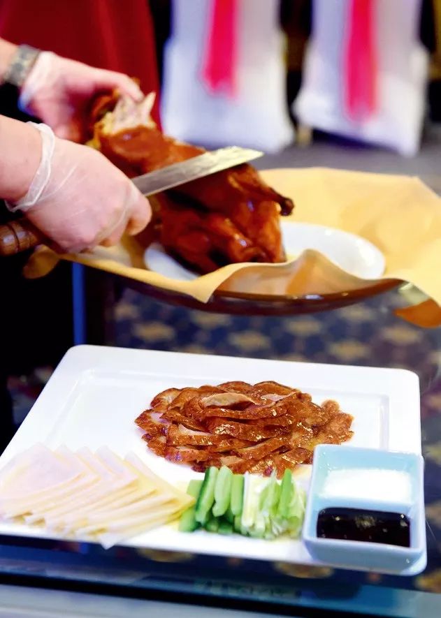 剛烤完的鴨子,一刀刀片好,皮肉分離。鴨皮蘸糖,放入口中,無須咀嚼,鴨皮入口即化,酥香悠長的回味在齒間彌漫。