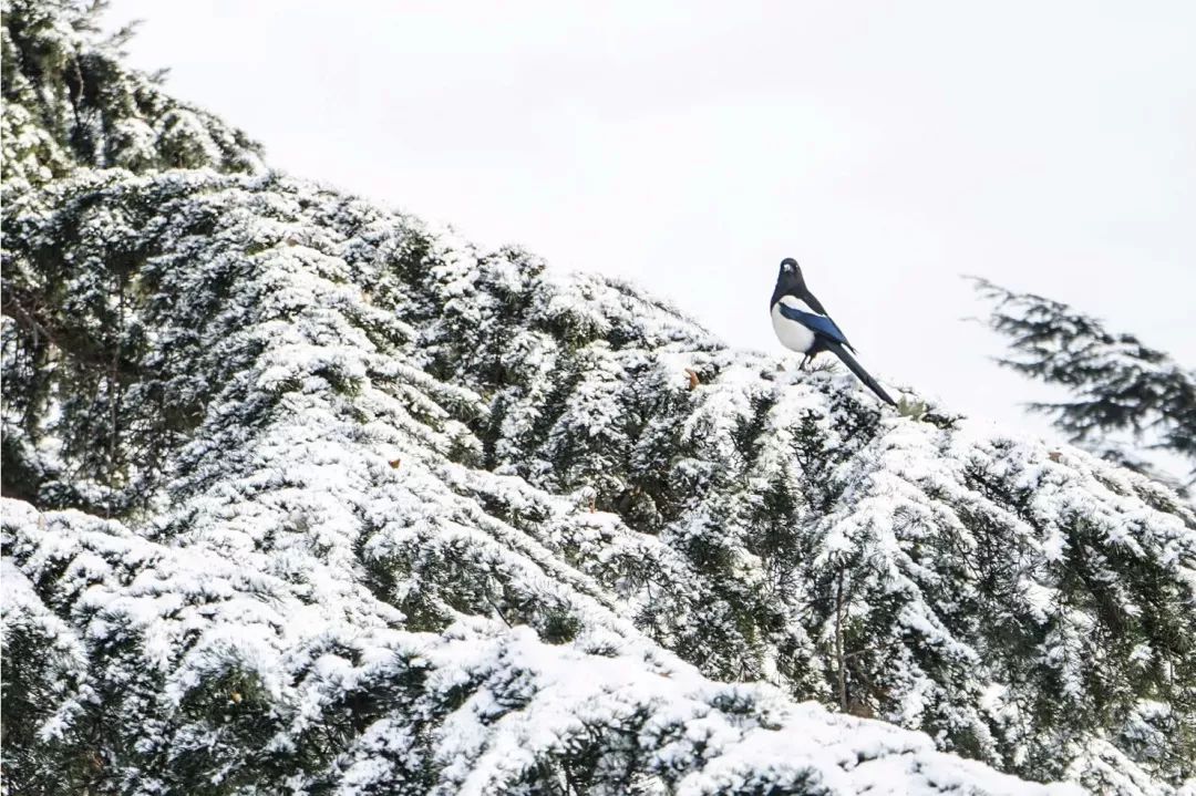2019-01-10,遼寧省大連市。喜鵲站在落滿雪的樹梢上,告訴我們,春不久就會(huì)來(lái)了。作者:123
