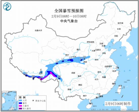 中央氣象臺2月9日06時繼續(xù)發(fā)布暴雪預(yù)報。預(yù)計,9日08時至10日08時,陜西中部、甘肅東部、青海東部和南部、西藏東部和南部、山西西南部等地的部分地區(qū)有大到暴雪,其中,西藏南部和東部的局部地區(qū)有大暴雪或特大暴雪(見圖1)。