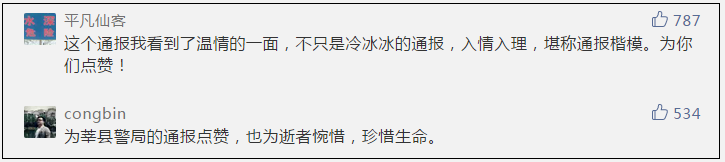 撰寫這份通報的莘縣公安局宣傳科室相關負責人稱,通報發布后,他們收獲了很多暖心留言。“其實我們這樣寫通報的原因很簡單,就是站在死者家屬的角度、立場去考慮這個事情。”