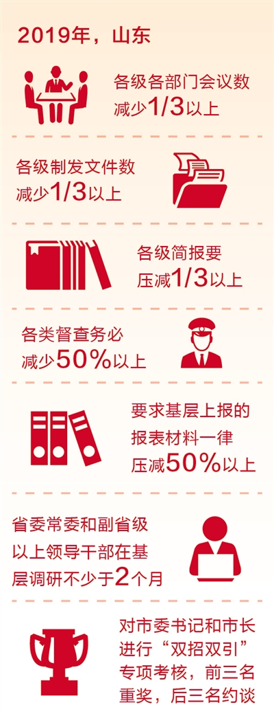 山東提出,事關拍板定事、研究政策、解決問題的會議,要及時開,開精開好。不開沒有實質性內容的會議。提倡開短會,不得要求無關人員層層陪會;提倡發短文,不發沒有實質性內容的文件。不得將“全國”“全省”改成“全市”“全縣”,制定出所謂的“新”下發文件,搞“上下一般粗”。文件要務實管用,原則上不超過3000字。
