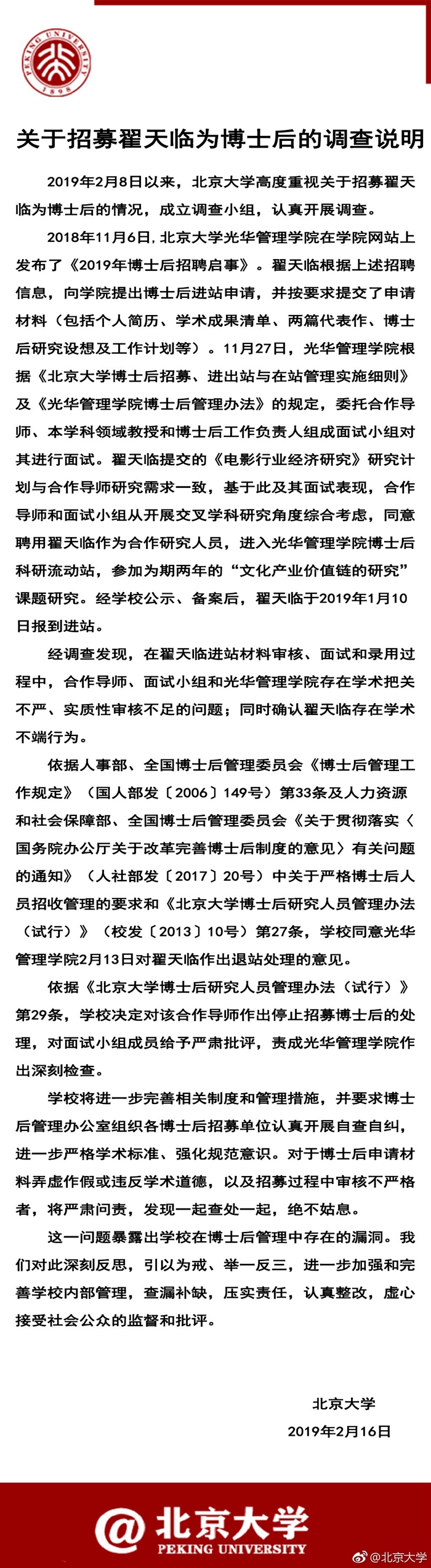 北大:對翟天臨作出博士后退站處理
