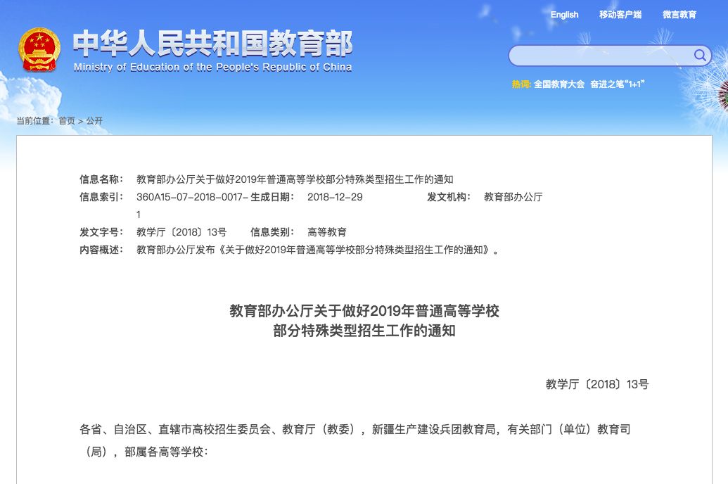 中國青年報注意到,去年12月,教育部下發(fā)《關(guān)于做好2019年普通高等學(xué)校部分特殊類型招生工作的通知》,發(fā)布2019年普通高等學(xué)校部分特殊類型招生基本要求。