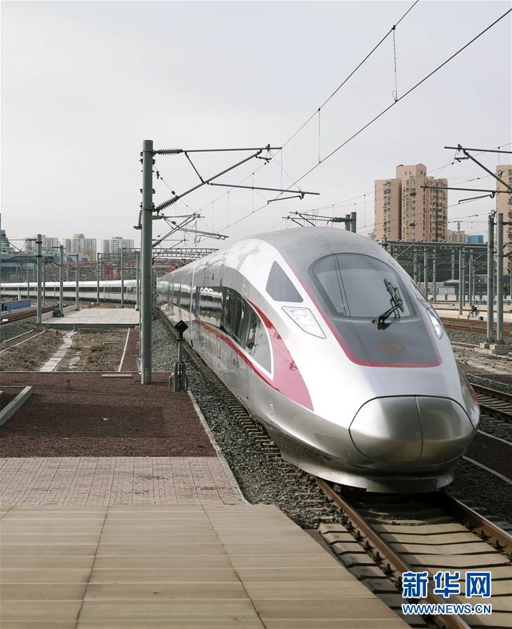 1月5日,超長版時速350公里“復(fù)興號”G9次動車組駛?cè)氡本┠险尽P氯A社發(fā)(陳曉根 攝)