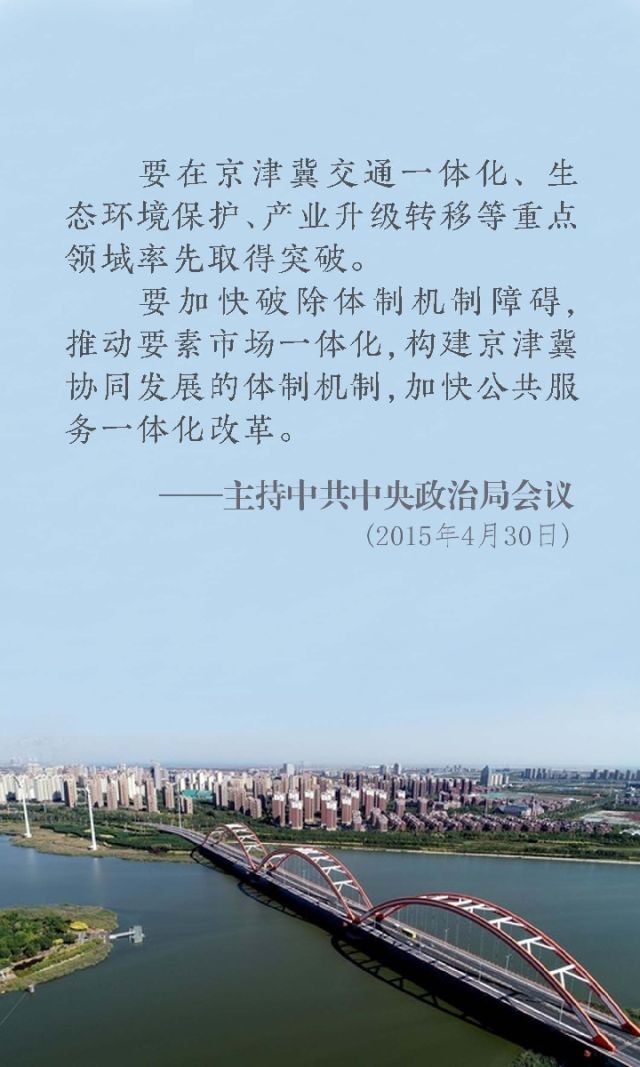 在京津冀協同發展每一個重要階段和關鍵環節,習近平總書記都親自把脈定向,為京津冀協同發展工作指明方向。總書記多次強調,京津冀協同發展是個大思路、大戰略,要通過疏解北京非首都功能,調整經濟結構和空間結構,走出一條內涵集約發展的新路子,探索出一種人口經濟密集地區優化開發的模式,促進區域協調發展,形成新增長極。