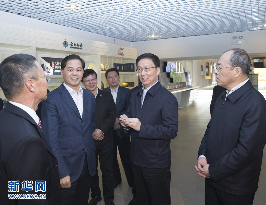 韓正到云南白藥集團,考察生產車間,了解生產情況,參觀云南白藥博物館。韓正指出,推動國有企業改革發展,要強化品牌建設,打造具有國際影響力的民族品牌;要加大研發投入,掌握關鍵核心技術;要完善治理體系和治理結構,推進混合所有制改革。