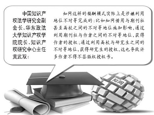 中國知識產權法學研究會副會長、華東政法大學知識產權學院院長、知識產權研究中心主任黃武雙告訴記者,知網這樣的稿酬模式實際上是涉嫌利用地位不對等完成的:比如知網借用與期刊社甚至高校之間的不對等地位施加影響,通過利用期刊社與作者之間的不對等地位,獲得作者的授權;通過利用高校與研究生之間的不對等地位,獲得研究生的授權,這也導致許多作者不得不簽版權授權書。