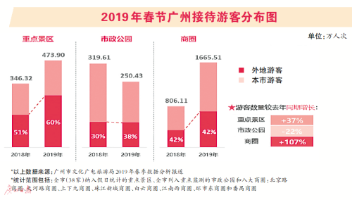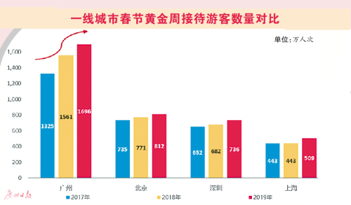 2019年春節,廣州創下游客接待量和旅游業總收入“雙新高”,共接待旅客1696.27萬人次,較2018年同期增長8.66%,高于北京的811.70萬人次、上海的509.20萬人次,居一線城市首位,分別是北京的兩倍和上海的三倍;旅游業創收122億元,實現9.74%的增長,高于北京的81.85億元和上海的66.20億元,分別是北京的1.5倍和上海的1.8倍。