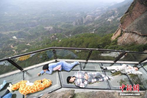 資料圖:2017年3月21日,正值世界睡眠日,游人身著卡通睡衣躺在湖南平江石牛寨的懸崖玻璃棧道上,擺出各種睡姿享受睡眠,以此行為藝術呼吁關注睡眠健康。 楊華峰 攝