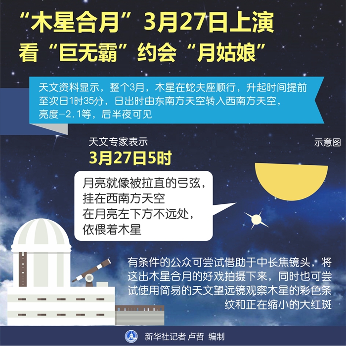 “有條件的公眾可嘗試借助于中長焦鏡頭,將這出木星合月的好戲拍攝下來,同時也可嘗試使用簡易的天文望遠鏡觀察木星的彩色條紋和正在縮小的大紅斑。”趙之珩提醒說。