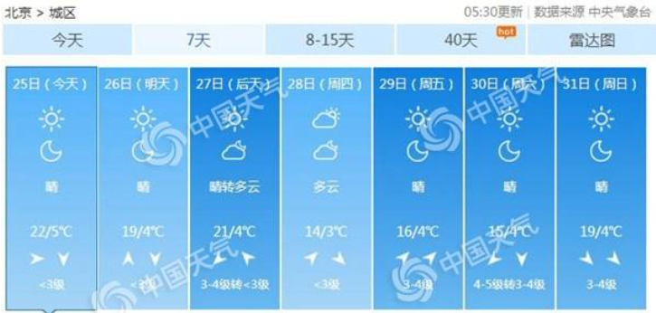 預(yù)計(jì),本周(25-31日)北京天氣以晴為主,氣溫多起伏,其中今天最高氣溫22℃,周四將降至14℃,乍暖還寒,公眾還需關(guān)注臨近預(yù)報(bào),根據(jù)天氣適當(dāng)增減衣物。
