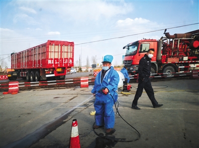 陜西省榆林市靖邊縣發(fā)生非洲豬瘟疫情后,3月9日,靖邊張家畔一公路交叉口,工作人員在交警配合下,對過往車輛噴灑消毒液。 圖/視覺中國