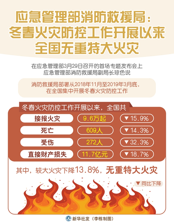 新華社北京3月29日電(記者葉昊鳴)“冬春火災(zāi)防控工作開展以來,全國共接報(bào)火災(zāi)9.6萬起、亡609人、傷272人、直接財(cái)產(chǎn)損失11.7億元,四項(xiàng)指數(shù)同比分別下降15.9%、14.3%、32.3%和18.7%。其中,較大火災(zāi)下降13.8%,無重特大火災(zāi)。”應(yīng)急管理部消防救援局副局長瓊色說。
