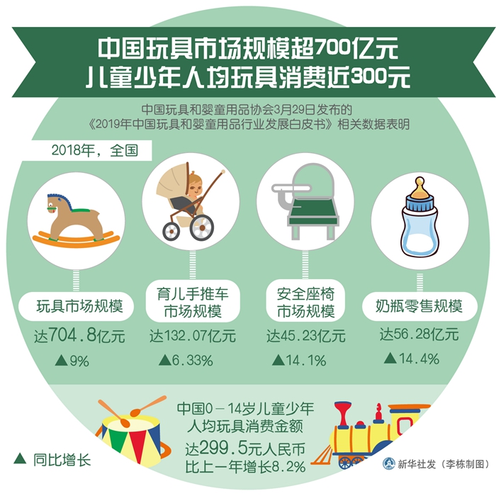 新華社上海3月29日電(記者 吳宇)2018年,中國0-14歲兒童少年人均玩具消費金額達299.5元人民幣,比上一年增長8.2%;2019年,中國65.6%的消費者計劃增加玩具消費支出,63.9%的消費者計劃增加嬰童用品消費支出。