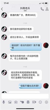 4月10日,一位自稱是國(guó)內(nèi)某抖商培訓(xùn)機(jī)構(gòu)的代理商劉方(化名)在QQ群中招募“推廣員”。記者以兼職的名義聯(lián)系上后,劉方聲稱,只需要繳納599元就能上任。“到時(shí)候會(huì)給你一套完整的說辭,以及具體的價(jià)格表。”