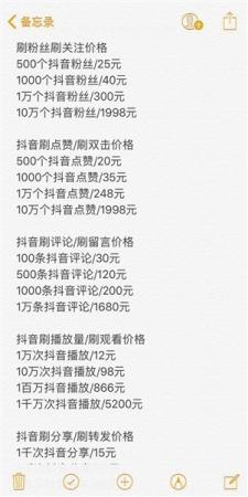 抖音刷粉、點(diǎn)贊等“業(yè)務(wù)”收費(fèi)價(jià)格。
