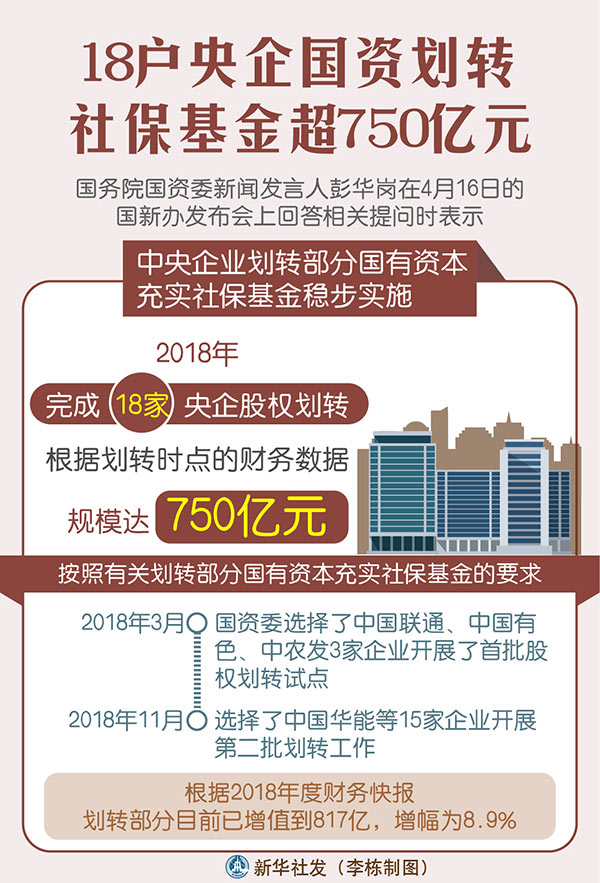 新華社北京4月16日電(記者王希)國務院國資委新聞發言人彭華崗16日說,中央企業劃轉部分國有資本充實社保基金穩步實施,2018年完成18家央企股權劃轉,根據劃轉時點的財務數據,規模達750億元。