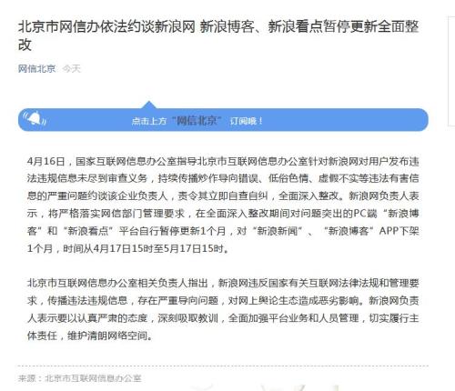 新浪網(wǎng)負(fù)責(zé)人表示,將嚴(yán)格落實網(wǎng)信部門管理要求,在全面深入整改期間對問題突出的PC端“新浪博客”和“新浪看點”平臺自行暫停更新1個月,對“新浪新聞”、“新浪博客”APP下架1個月,時間從4月17日15時至5月17日15時。