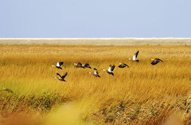 這組照片拍攝于上海著名的崇明東灘濕地,當時正值初冬時節。曲水彎環的蘆葦叢中,成群結隊的越冬候鳥時而悠閑覓食,時而群鳥歡飛,譜寫了一曲美妙的自然樂章。