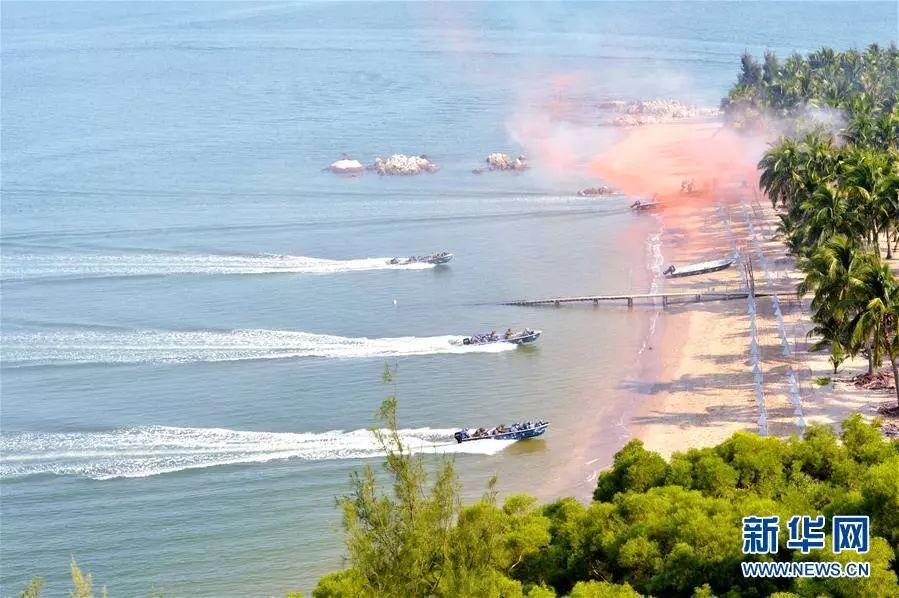 2016年9月18日,中俄“海上聯合-2016”演習舉行立體奪控島礁演練。這是陸戰隊員乘舟沖上灘頭。新華社發(孫宏韜 攝)