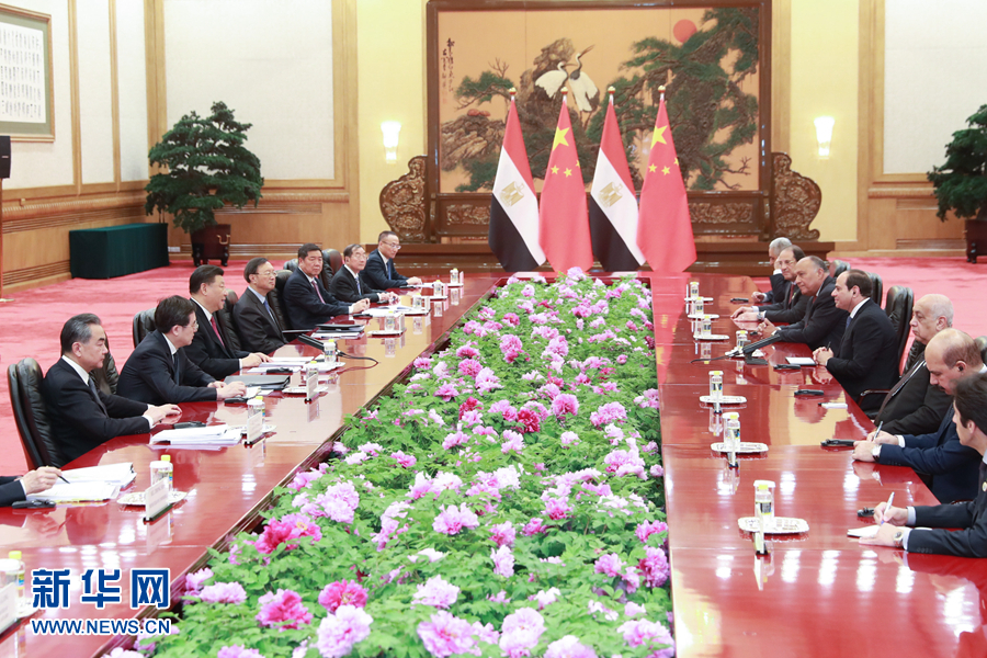 習近平強調,埃及是非洲聯盟輪值主席國,總統先生來華出席第二屆“一帶一路”國際合作高峰論壇,不僅體現了埃及積極參與共建“一帶一路”的真誠意愿,也代表著非洲國家尋求互利共贏、實現共同發展的普遍呼聲。中方高度重視發展同埃及關系。雙方要深化政治互信,繼續在涉及彼此核心利益和重大關切問題上相互支持和配合。中方始終支持埃及探索符合本國國情的發展道路,愿積極參與蘇伊士運河走廊開發計劃,持續推進蘇伊士經貿合作區建設及產能、基礎設施建設等領域合作。中方還將在埃及設立“魯班工坊”,向埃及青年提供職業技能培訓。雙方要深化反恐和安全合作,持續密切人文交流。中國感謝非洲人民對中國的信任,我們支持非洲和平安全與可持續發展倡議和非洲一體化進程,愿同埃方加強對非三方合作,共同促進非洲基礎設施建設。