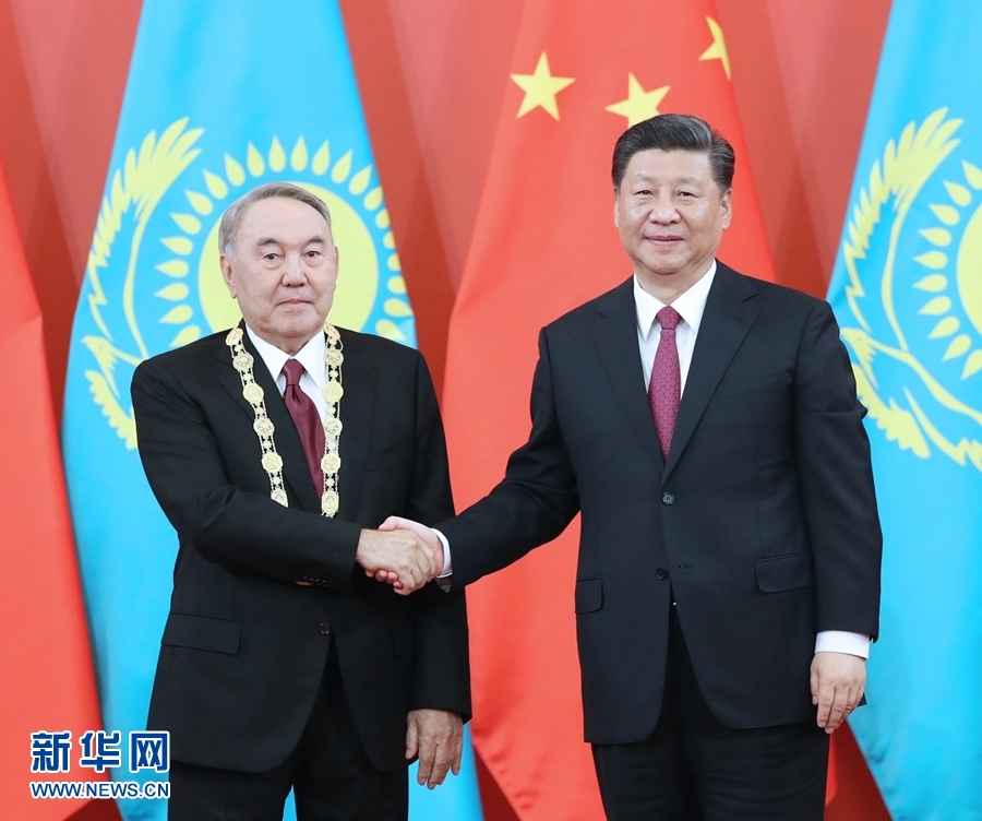 4月28日,國家主席習近平在北京人民大會堂中央大廳為哈薩克斯坦首任總統納扎爾巴耶夫舉行“友誼勛章”頒授儀式。新華社記者 鞠鵬 攝