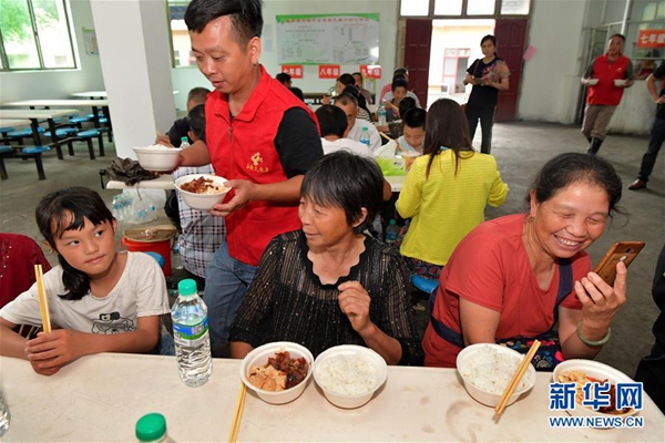6月9日,在江西省吉安市永新縣高橋樓鎮(zhèn)高橋中學(xué)安置點內(nèi),志愿者為受災(zāi)村民端來熱飯熱菜。新華社記者 彭昭之 攝