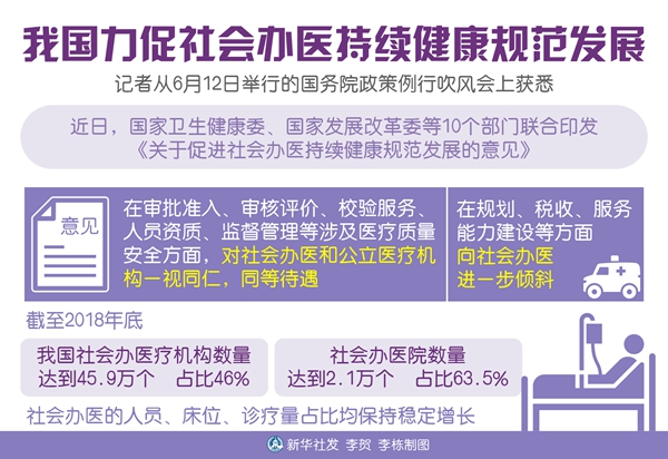 據介紹,意見在審批準入、審核評價、校驗服務、人員資質、監督管理等涉及醫療質量安全方面,對社會辦醫和公立醫療機構一視同仁,同等待遇;在規劃、稅收、服務能力建設等方面,向社會辦醫進一步傾斜。