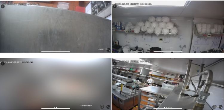 5月29日,“海淀陽光餐飲”APP上,味千拉面(SOGO本館店)、西少爺(復(fù)興門店)、成都小吃(西便門內(nèi)大街)、那家小館百盛店,均存在攝像頭被遮擋、角度對(duì)不準(zhǔn)或拍不到廚師工作的現(xiàn)象。圖片來源:新華社客戶端