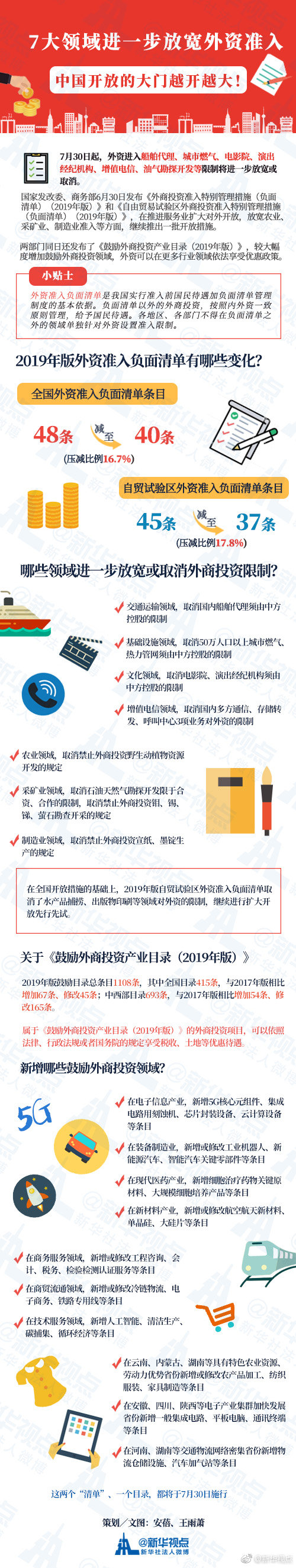 7月30日起,外資進(jìn)入船舶代理、城市燃?xì)?、電影院、演出?jīng)紀(jì)機(jī)構(gòu)、增值電信、油氣勘探開發(fā)等限制將進(jìn)一步放寬或取消。國(guó)家發(fā)改委、商務(wù)部6月30日發(fā)布《外商投資準(zhǔn)入特別管理措施(負(fù)面清單)(2019年版)》,清單條目由48條減至40條。同日發(fā)布的《自由貿(mào)易試驗(yàn)區(qū)外商投資準(zhǔn)入特別管理措施(負(fù)面清單)(2019年版)》條目由45條減至37條。(記者安蓓、王雨蕭)?