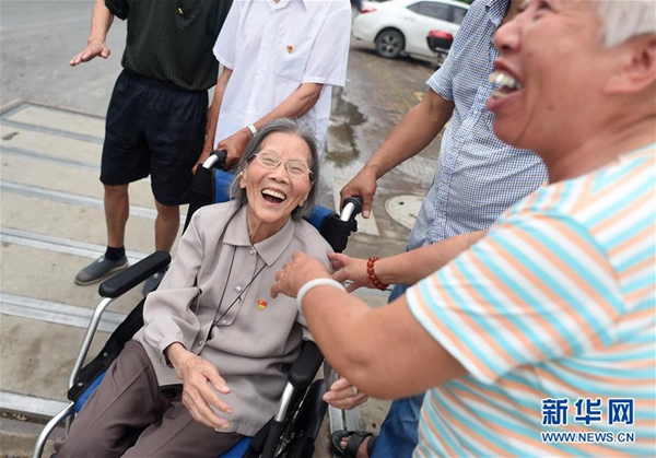 7月1日,呂銀芬(前右)來到七一村黨群服務(wù)中心參加“七一”主題黨日活動。新華社記者 韓傳號 攝