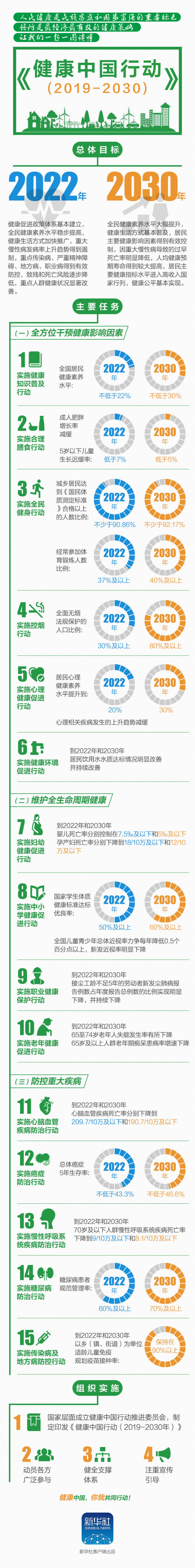 (一)加強組織領導。國家層面成立健康中國行動推進委員會,制定印發《健康中國行動(2019-2030年)》,細化上述15個專項行動的目標、指標、任務和職責分工,統籌指導各地區各相關部門加強協作,研究疾病的綜合防治策略,做好監測考核。要根據醫學進步和相關技術發展等情況,適時組織修訂完善《健康中國行動(2019-2030年)》內容。各地區要結合實際健全領導推進工作機制,研究制定實施方案,逐項抓好任務落實。各相關部門要按照職責分工,將預防為主、防病在先融入各項政策舉措中,研究具體政策措施,推動落實重點任務。