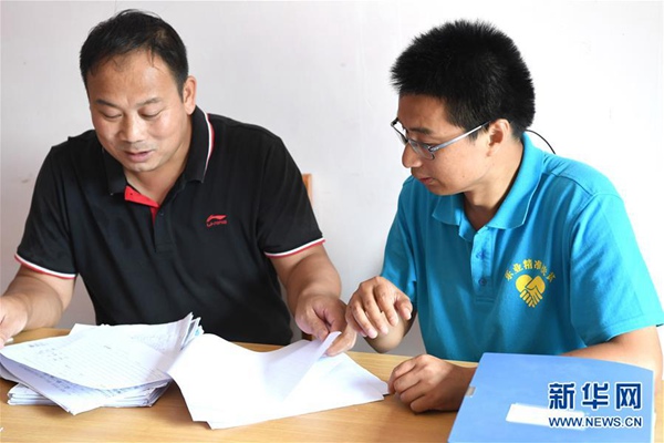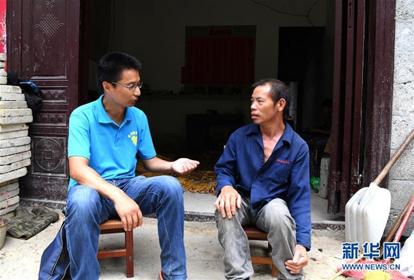 楊杰興(左)在廣西樂業(yè)縣百坭村向村民了解孩子讀幼兒園的情況(8月1日攝)。新華社記者 周華 攝