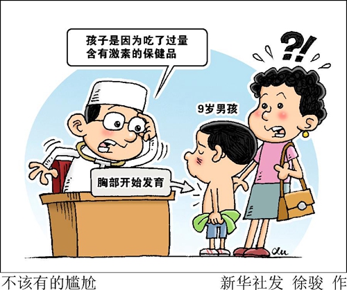 9歲的成都男孩浩浩,遇到了這個(gè)年齡和性別不該有的尷尬,他的胸部竟然開(kāi)始發(fā)育了。經(jīng)醫(yī)生診斷,孩子是因?yàn)槌粤诉^(guò)量含有激素的保健品。類似浩浩這樣因?yàn)榉帽=∑穾?lái)身體損傷的例子并不少見(jiàn)。