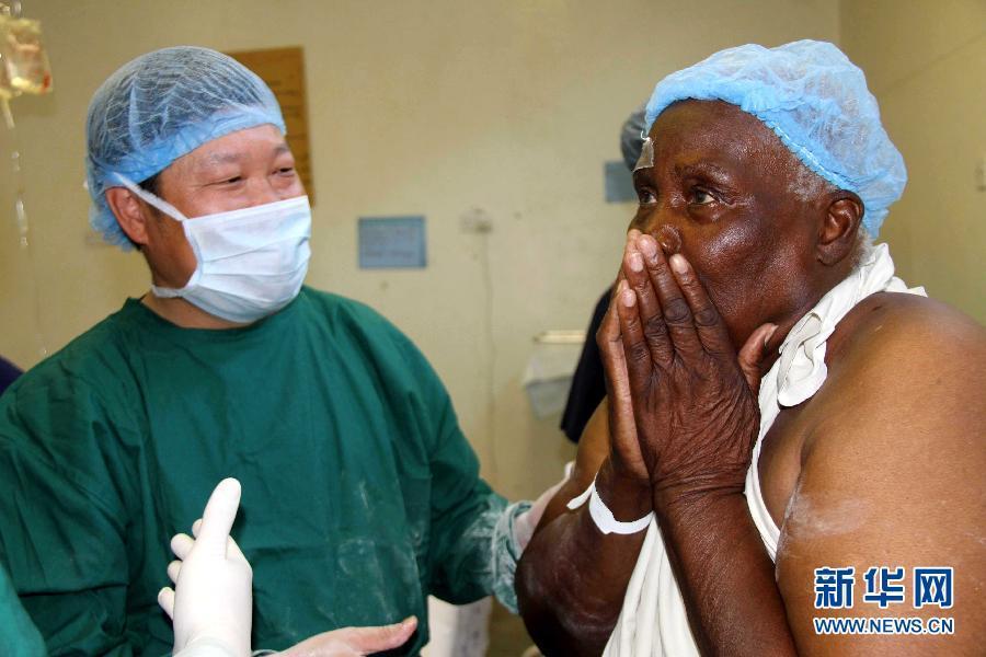 2010年11月23日,在津巴布韋首都哈拉雷郊區(qū)的奇通圭扎中心醫(yī)院,一位老人(右)在中國(guó)“非洲光明行”醫(yī)療隊(duì)為其實(shí)施復(fù)明手術(shù)后重見光明,驚喜萬分。 新華社記者 李平 攝