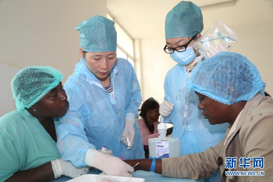 2014年12月10日,在塞拉利昂首都弗里敦,中國(guó)醫(yī)護(hù)人員在中塞友好醫(yī)院開展輸液培訓(xùn)活動(dòng)。新華社發(fā)(戴欣 攝)