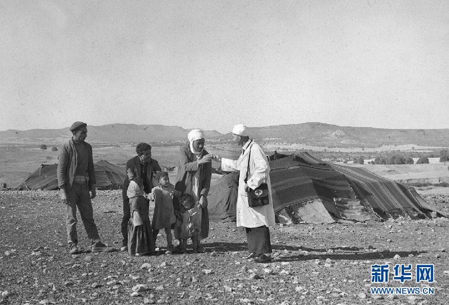 這張1965年的資料照片顯示,中國(guó)援阿醫(yī)生(右一)在阿爾及利亞賽伊達(dá)省為牧民診治。新華社發(fā)(王南生 攝)