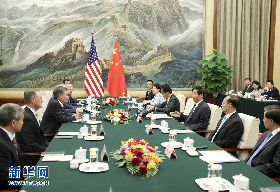 9月2日,全國人大常委會委員長栗戰書在北京人民大會堂會見美國國會參議院“美中工作小組”共同主席、參議員戴恩斯和參議員珀杜一行。 新華社記者 丁海濤 攝
