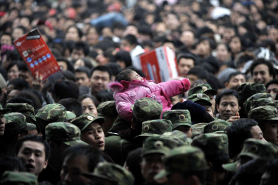 ↑2008年2月1日,武警戰(zhàn)士從廣州火車站密密麻麻的人群中把一個(gè)孩子手遞手托舉出來。新華社發(fā)
