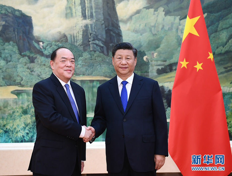 9月11日,國家主席習近平在人民大會堂會見新當選并獲中央政府任命的澳門特別行政區第五任行政長官賀一誠。 新華社記者 謝環馳 攝