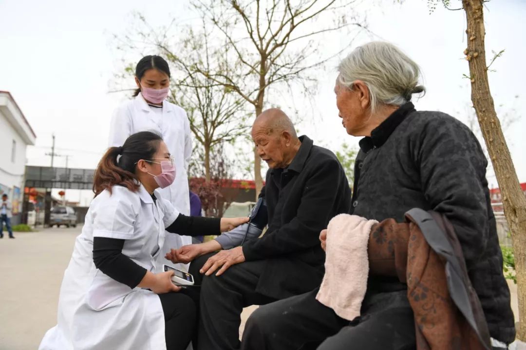 醫護人員在巨鹿縣南大韓村菘樂敬老院為老人測量血壓 牟宇 攝