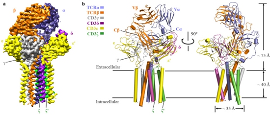 對此,文章審稿人的評價是:“該研究工作代表了細胞適應性免疫的分子機理研究的一個重要里程碑。通過闡明第一個在膜上組裝的T細胞受體和其CD3共受體的結構,極大地增加了我們對T細胞識別抗原反應的激活機制的理解?!?/p>