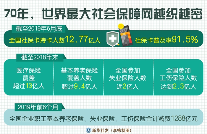1951年2月26日,新中國(guó)成立后第一個(gè)社會(huì)保險(xiǎn)法規(guī)《中華人民共和國(guó)勞動(dòng)保險(xiǎn)條例》頒布。70年來(lái),一系列政策措施頒布實(shí)施,給老百姓帶來(lái)實(shí)實(shí)在在、看得見摸得著的好處。社會(huì)保障不斷加強(qiáng),織就世界最大的社會(huì)保障網(wǎng)。