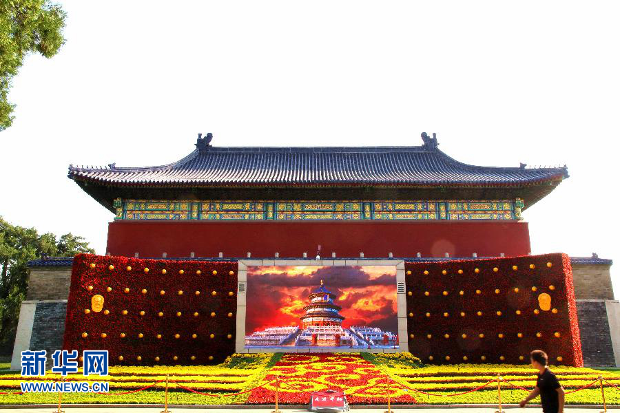 游人從北京天壇公園的立體花壇前走過(9月26日攝)。新華社發