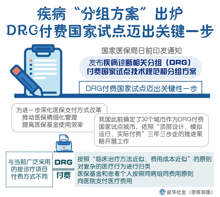 新華社北京10月24日電(記者張泉)國家醫(yī)保局日前印發(fā)通知,發(fā)布疾病診斷相關(guān)分組(DRG)付費國家試點技術(shù)規(guī)范和分組方案,DRG付費國家試點邁出關(guān)鍵性一步。