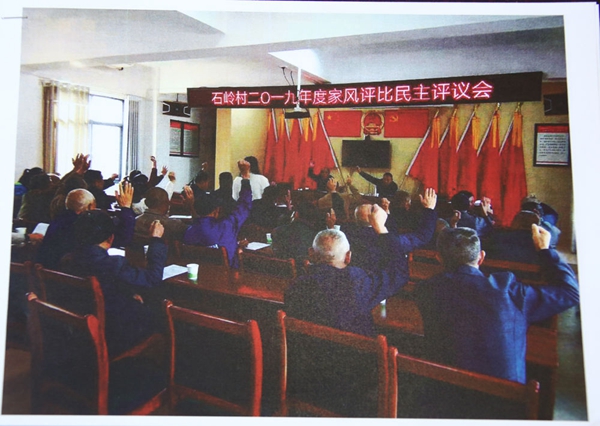 ▲湖南岳陽平江縣梅仙鎮石嶺村家風評比現場(翻拍)。