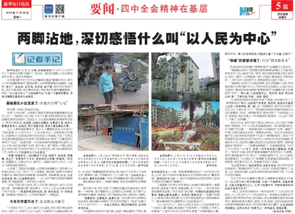 ▲2019年11月26日《新華每日電訊》五版刊載題為《兩腳沾地,深切感悟什么叫“以人民為中心”》的報道。